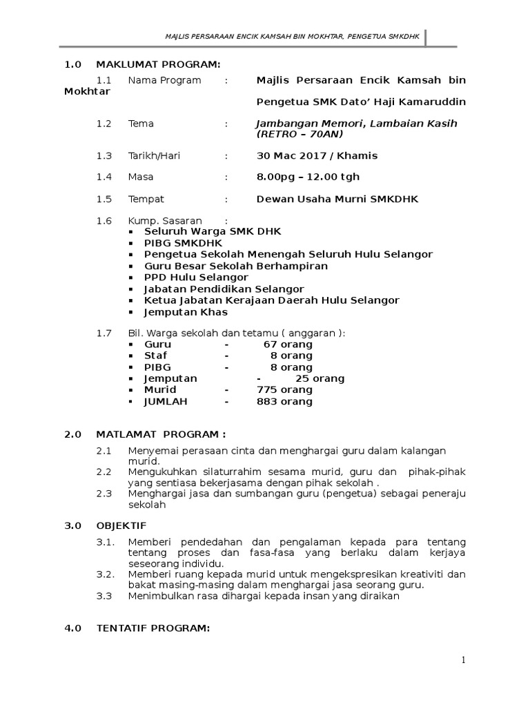 11 Nama Program. Kongsi dan muat turun KERTAS KERJA MAJLIS PERSARAAN secara percuma. Ini adalah bagi mengenang jasa pegawai yang diraikan setelah sekian lama berbakti kepada.